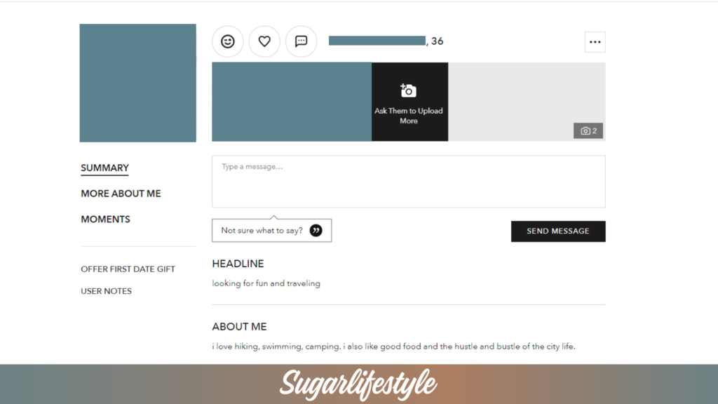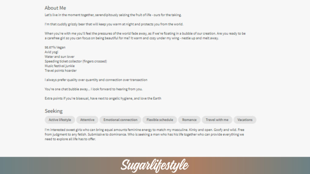 The detailed bio is among the main strengths of this profile too. However, it lacks more specific info for a sugar baby, like potential allowance or more detailed expectations.