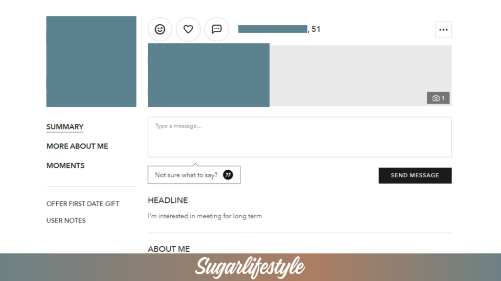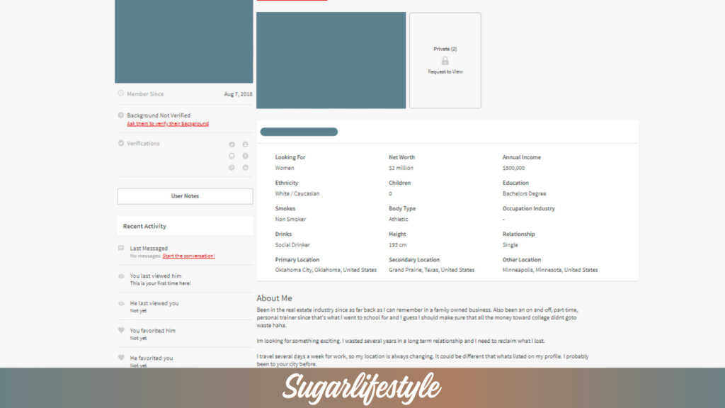 This profile is a bit short. There is some information about the sugar daddy and expectations from the sugaring, but it is not enough. The profile lacks more details on requirements, income, and potential sugar baby’s allowance. And two selfies are also not enough for a perfect profile, as you ideally need one headshot, a full-body photo, and a candid photo.